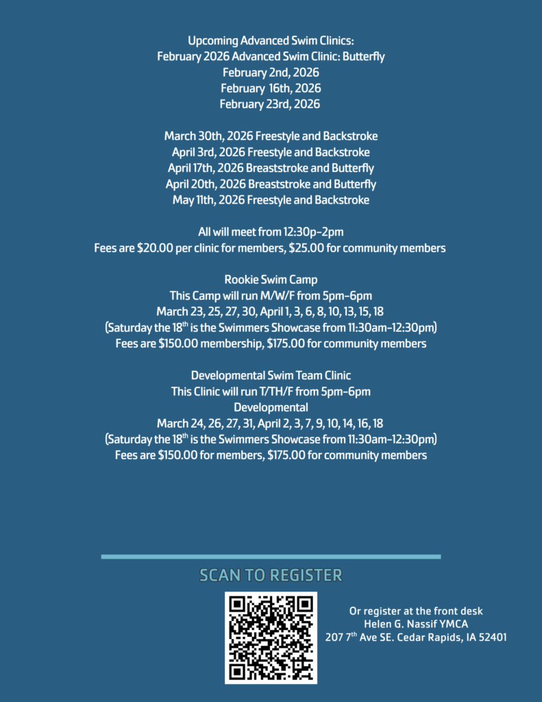The Helen G. Nassif YMCA in Cedar Rapids opened in August 2002 and features three full size basketball courts with 8 hoops and 6 pickleball courts, four racquetball/handball courts, 6-lane lap pool and spa, group exercise studio, multi-purpose room, a Queenax™ functional training system by Precor®, ample cardio and free weight equipment, locker rooms for men, women, boys and girls, as well as, a family changing room. A sauna and steam room are in each of the men’s and women’s locker rooms.