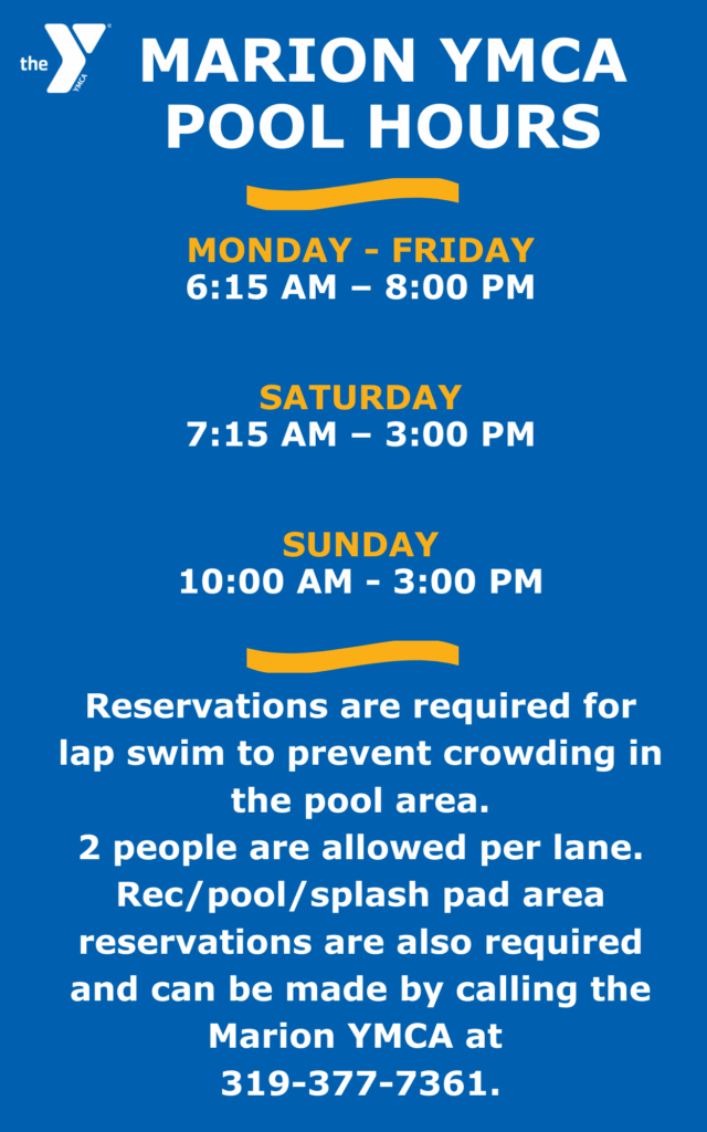 Up to 25 individuals can now use the rec pool per time slot. Reservations for the rec pool (i.e. “open swim”) are not available to make online or through the Y’s mobile app – reservations need to be made for a time slot by calling the Marion YMCA’s front desk at (319) 377-7361. Please make a reservation for each individual in your party that will be swimming. Reservations can be made up to one day in advance.